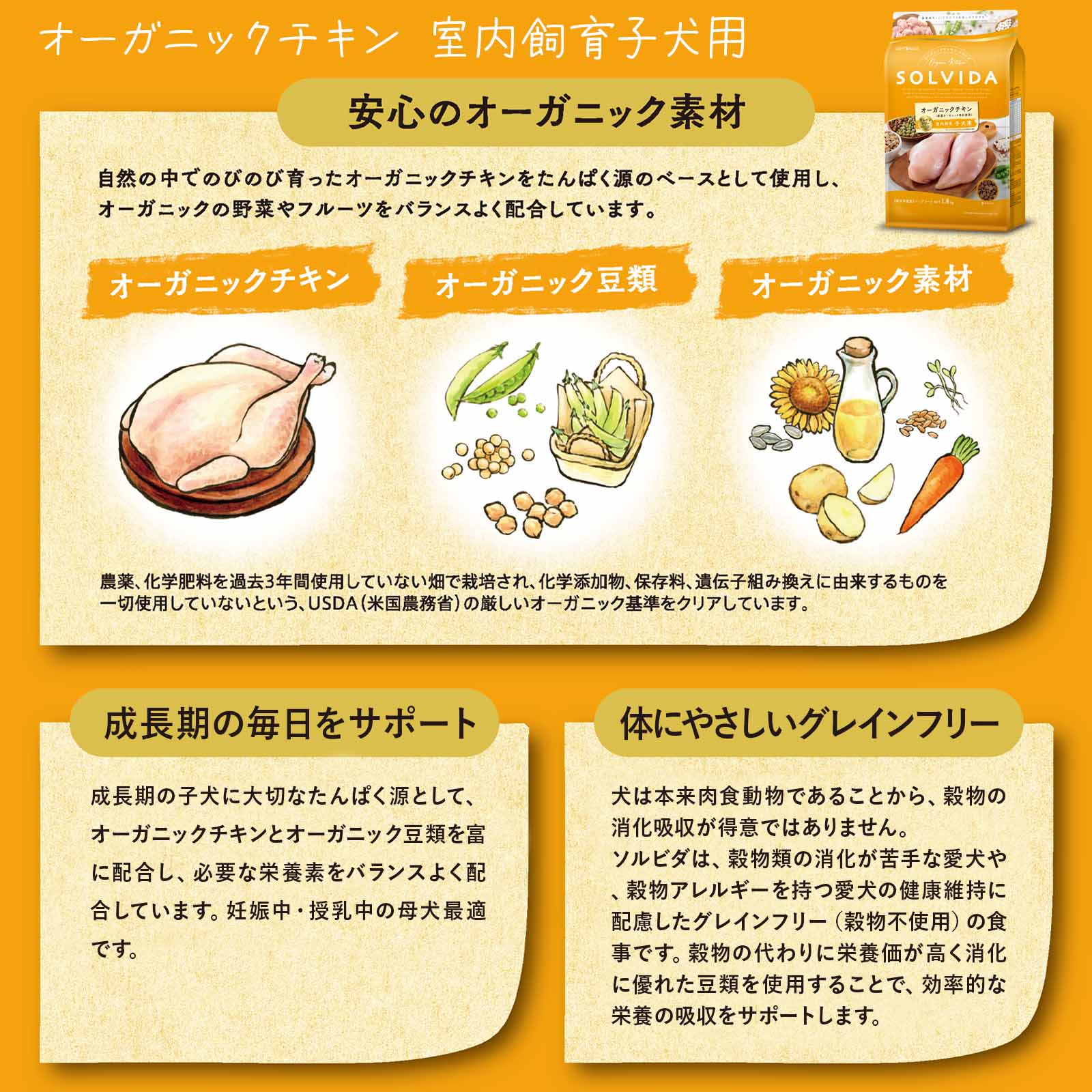 成長期は一生の健康を左右する大切な期間。良質なオーガニックチキンと豆類をたんぱく源とし、栄養価の高いオーガニック大豆粉を配合。成長に必要な栄養をバランスよく配合したレシピで、成長期の健やかな毎日を支えます。また、妊娠・授乳期の母犬にも適しています。
