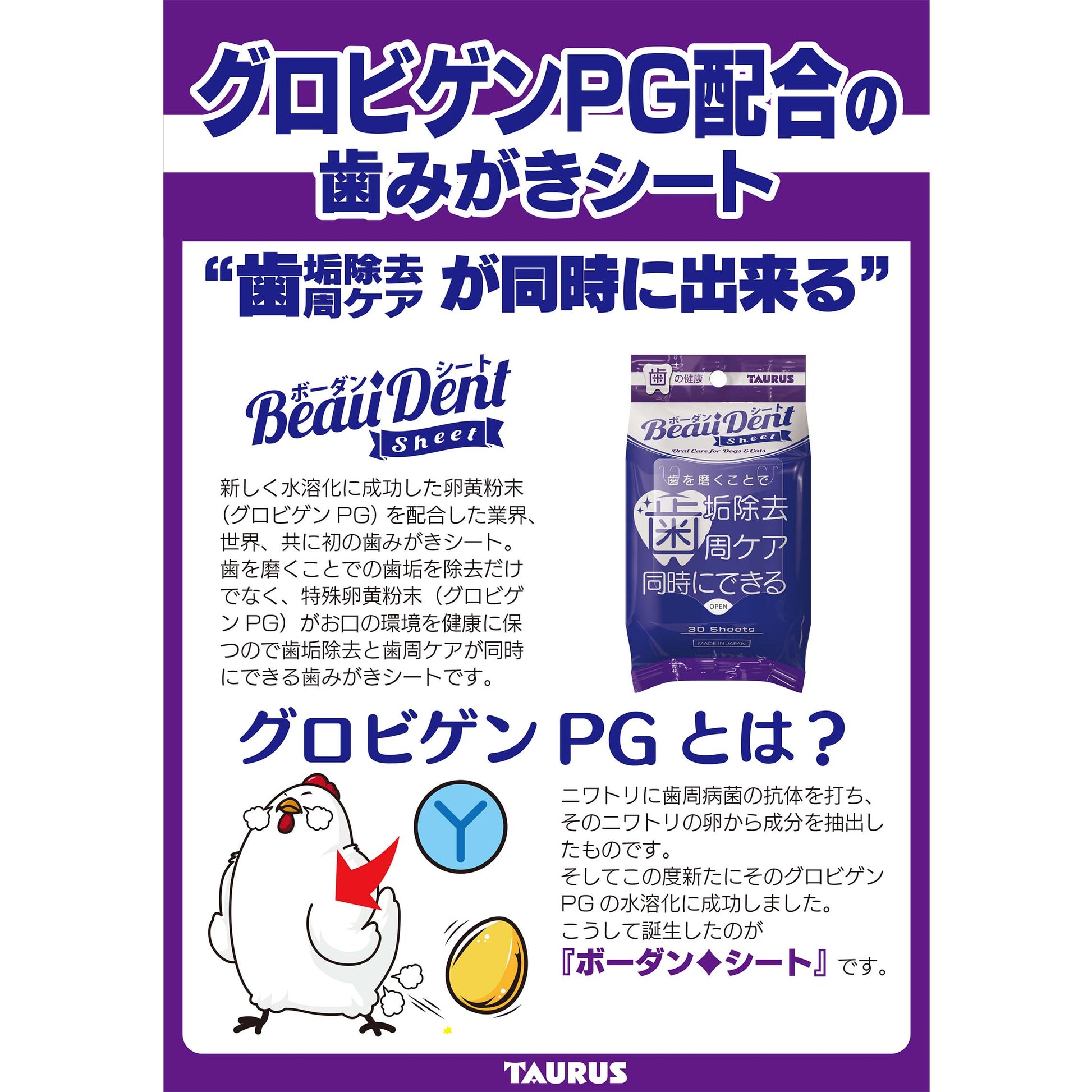 ボーダンシートは、歯周環境を清潔に維持する「卵黄粉末グロビゲンPG」を配合。